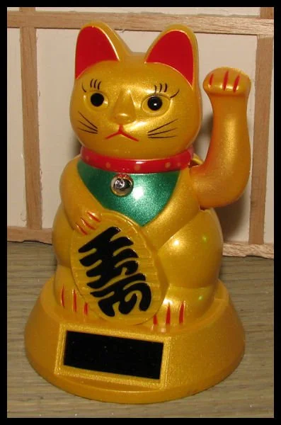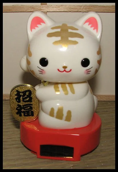 Solar powered nekos. They can have slots for signs or business cards, and they nod and wave when exposed to the sun.